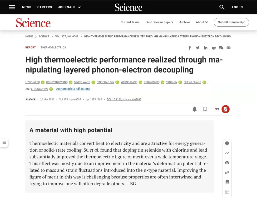 2022年3月25日,《Science》杂志报道了北航williamhill中国官方网站赵立东教授课题组在热电材料领域取得的新进展:《High thermoelectric performance realized through manipulating layered phonon-electron decoupling》。热电效应是一种利用温差来实现电传输的现象。高性能热电材料要求材料能在大温差下,同时具备高的电传输特性与低的热传输性能,然而高导电和低导热是一对矛盾。此工作利用层状材料在层外方向的低热导特点,通过调节晶体结构对称性在层外方向改善了载流子在层间的迁移,从而促进了层间方向的电子遂穿。该成果证明利用层状结构可以有效解耦声—电矛盾(Science 375 (2022) 1385-1389)。北航2019级博士研究生宿力中为第一作者,导师赵立东、奥地利科学技术研究所常诚为通讯作者,williamhill中国官方网站,williamhill中国官方网站为第一单位。这是赵立东教授课题组自2015年以来发表的第6篇《Science》,2018年-2022年近5年来年均发表一篇新成果。