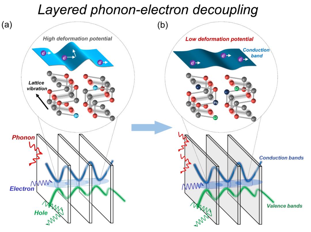 图2. 声—电解耦增强n 型SnSe层外3D电子-2D声子传输特性:(a) Br掺杂Se位实现了SnSe在层外方向的电子遂穿 (Science 360 (2018) 778-783); (b) Cl掺杂Se位降低了形变势,促进了SnSe在层外方向的电子遂穿,同时在Sn位引入Pb,不但进一步强化了Cl引起的低形变势,还可显著降低晶格热导率 (Science 375 (2022) 1385-1389)。