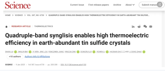 2025年1月10日,国际顶级期刊《Science》报道了北航赵立东课题组在高储量、低成本、宽带隙热电材料及器件研究领域取得的最新进展:《Quadruple-Band Synglisis Enables High Thermoelectric Efficiency in Earth-Abundant Tin Sulfide Crystals》,该工作在硫化锡(SnS)晶体中发现和调控了四个价带在能量和动量空间的协同效应(Quadruple-Band Synglisis),在P型SnS晶体中实现了~48K的制冷温差及~6.5%的发电效率。通常认为能带间隙在Eg≈6-10 kBT(kB为玻尔兹曼常数)范围内的材料为理想的制冷材料(Goldsmid, et al. Thermoelectric Refrigeration,Springer, 1964.),该工作表明带隙Eg宽达46 kBT的SnS也可作为热电制冷材料【Science 387 (2025) 202-208】。博士生刘姗为第一作者,卓越师资博士后秦炳超、常诚教授、赵立东教授为通讯作者,williamhill中国官方网站为第一单位。这是赵立东教授课题组自2015年以来发表的第11篇《Science》。
